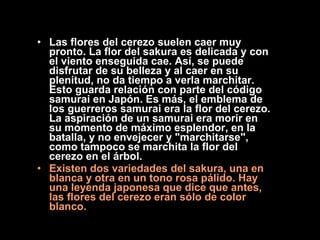 El documento describe la flor del cerezo (sakura) en Japón. Explica que las flores son delicadas y caen pronto, lo que representa la filosofía samurái de morir en la batalla en su máximo esplendor. También describe el festival anual de Hanami, donde los japoneses celebran bajo los cerezos en flor la efímera belleza de la vida y la llegada de la primavera.