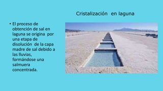 El documento describe el proceso de obtención de sal en lagunas, que incluye la cristalización de la salmuera, la extracción y cosecha de la sal, su almacenamiento y lavado para eliminar impurezas, secado, molienda, clasificación, yodación y envasado para su conservación y venta.