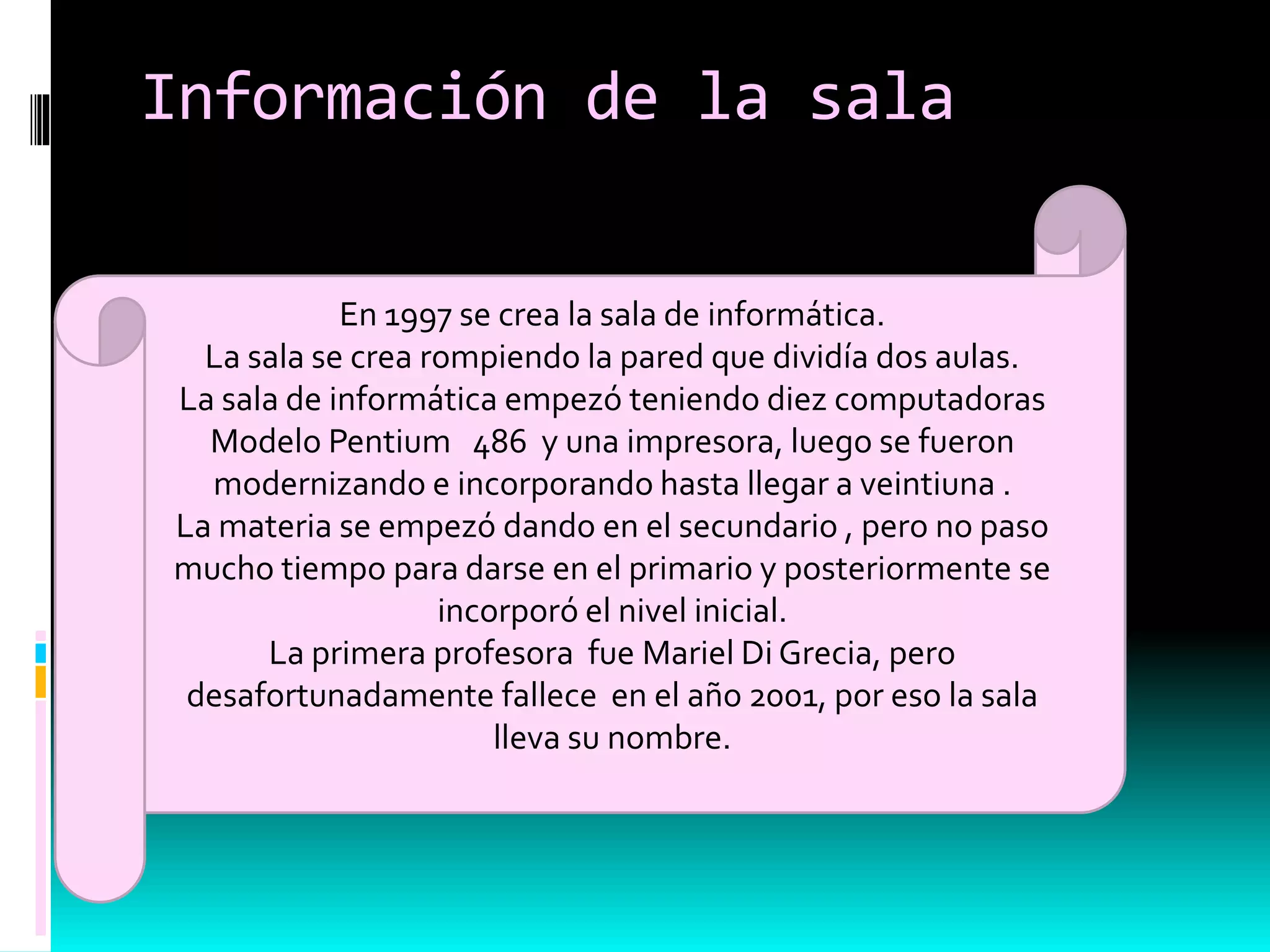 La sala de computación del colegio Redemptrix Captivorum se creó en 1997 al unir dos aulas. Comenzó con 10 computadoras Pentium 486 y una impresora, y fue modernizándose hasta tener 21 computadoras. La primera profesora fue Mariel Di Grecia, por lo que la sala lleva su nombre. Actualmente los profesores Hernán Spatola y Martin Ari Ragone enseñan informática en la sala.