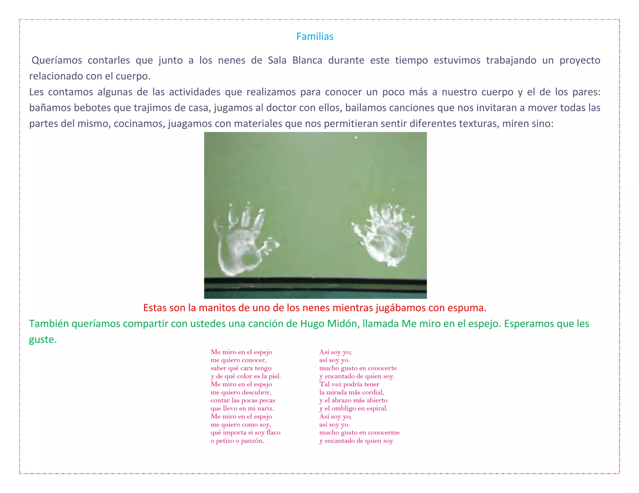 El resumen describe las actividades realizadas por los niños de la Sala Blanca para conocer su propio cuerpo y el de sus compañeros, incluyendo bañar muñecos, jugar al doctor, bailar canciones que mueven diferentes partes del cuerpo, cocinar, jugar con materiales de texturas diferentes, y escuchar la canción "Me miro en el espejo" de Hugo Midón.