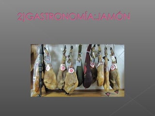El documento habla sobre una plaza en España que mide 1,400 metros cuadrados y donde se puede observar la Iglesia de San Benito y la Clerecía. También menciona varios platos típicos de la región como el jamón, el hornazo, la chanfaina y los huevos con farinato. Además, explica una tradición durante el Corpus Christi donde unos hombres cubiertos de musgo recrean una guerra y el reinado de Alfonso VIII.