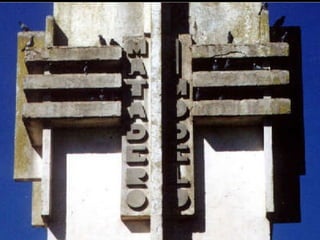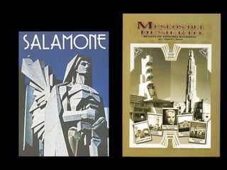 Este documento describe la obra arquitectónica de Francisco Salamone en la provincia de Buenos Aires entre 1936 y 1940. Salamone diseñó edificios públicos como municipalidades, plazas, mataderos y cementerios en un estilo art déco monumental que buscaba representar la autoridad del estado. Aunque su estilo combinaba diferentes elementos, su obra recibió poca atención debido a su asociación con el período político conocido como la "Década Infame". Hoy es reconocido como patrimonio cultural de la provincia.