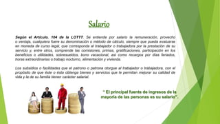 Este documento define el salario y sus diferentes tipos según la Ley Orgánica del Trabajo de Venezuela. Explica que el salario es la remuneración que recibe el trabajador por su servicio y puede incluir bonos y beneficios. Luego describe siete tipos de beneficios sociales de carácter no remunerativo y cuatro clases de salarios: por unidad de tiempo, por unidad de obra, por tarea y por comisión. Finalmente, cubre el salario mínimo garantizado por el Estado y su importancia para el contrato de trabajo y prestaciones social
