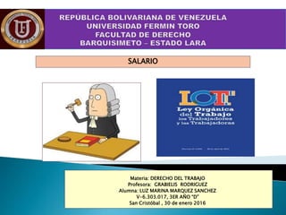 Este documento resume los principales puntos sobre el salario en la legislación laboral venezolana. Explica que el salario es irrenunciable y debe pagarse en moneda legal. También cubre cómo se calculan los salarios por hora, bonos nocturnos y horas extras, así como el salario base para vacaciones y prestaciones. Finalmente, incluye un caso práctico para ilustrar cómo aplicar estas disposiciones.
