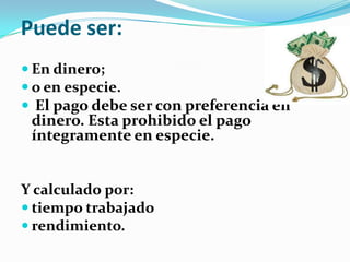 Este documento define el salario como cualquier ventaja económica que recibe un trabajador de forma normal y permanente por su contrato laboral. Explica que el salario puede ser en dinero o en especie, aunque el pago en dinero es preferible. Además, detalla que el salario se calcula por tiempo trabajado (días, meses, horas) o por rendimiento (destajo, comisión, incentivos), y que existen sistemas mixtos. Finalmente, brinda información sobre el salario mínimo en Uruguay y los plazos para el pago de sal