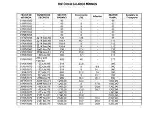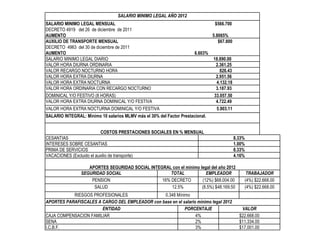 El documento resume la información sobre el salario mínimo legal en Colombia para el año 2012, incluyendo el salario mínimo mensual de $566.700, el auxilio de transporte de $67.800, y los valores horarios y prestaciones sociales asociadas con el salario mínimo para ese año. También incluye una tabla histórica con los valores del salario mínimo desde 1950 hasta 2012.