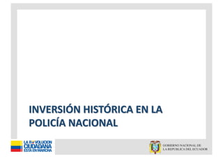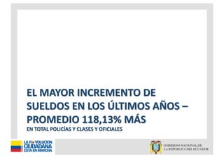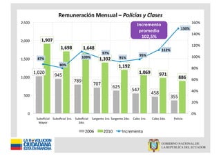 El documento presenta un análisis de la remuneración mensual de policías y oficiales, destacando incrementos significativos en sus sueldos entre 2006 y 2010. Además, se señala que el presupuesto de la policía nacional en 2010 es casi tres veces mayor al de 2003, incluyendo inversiones en equipamiento y mejoras en infraestructura. También se mencionan detalles sobre la asignación de recursos para seguridad y protección personal.