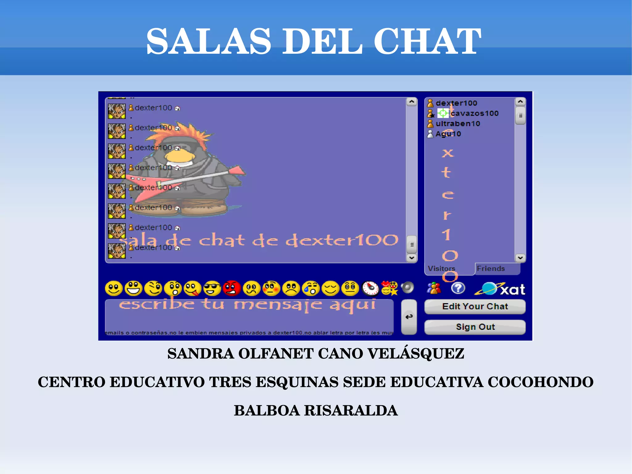 Este documento describe las salas de chat y su uso en la educación. El objetivo general es posibilitar situaciones que ayuden al conocimiento y manejo de las salas de chat y al desarrollo de hábitos lectores e investigativos. Se define una sala de chat como un espacio virtual para conversar por internet y se mencionan algunos usos educativos como trabajos colaborativos y clases virtuales. Finalmente, concluye que las salas de chat son una valiosa herramienta educativa que enriquece el proceso de enseñanza-aprendizaje