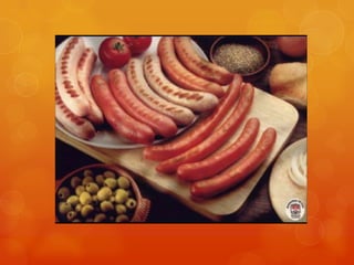 Una salchicha es un embutido elaborado principalmente de carne picada de cerdo o pavo que se somete a un proceso de escaldado para reducir microorganismos y coagular las proteínas formando una masa consistente. Las salchichas varían en su composición y método de preparación dependiendo del tipo, pero generalmente contienen proteínas, grasas y una pequeña cantidad de glúcidos, siendo bajas en fibra y vitaminas. Su calidad depende de seguir buenas prácticas higiénicas y de controlar parámetros como