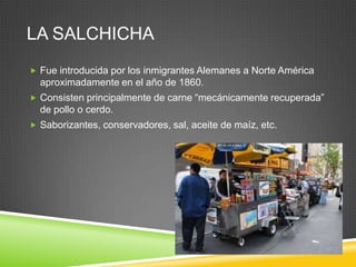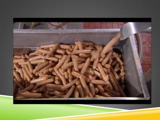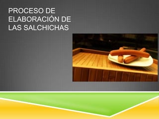 El proceso de elaboración de salchichas consiste en seleccionar las carnes, molerlas en una mezcladora junto con sal, saborizantes y conservadores, y convertir la mezcla en una pasta consistente que es envasada en tubos de celulosa. Las salchichas pasan por procesos de vaporización, horneado y enfriamiento antes de ser inspeccionadas, empacadas y distribuidas, con una capacidad de producción de 300,000 salchichas por hora en esta fábrica.