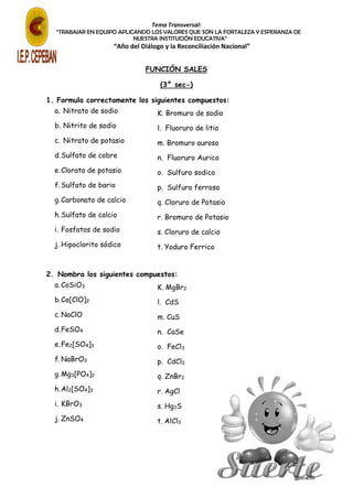 Este documento presenta una lista de ejercicios químicos sobre la formulación de compuestos inorgánicos. Se pide formular correctamente 22 compuestos iónicos y nombrar 20 compuestos dados sus fórmulas químicas. El objetivo es practicar la nomenclatura química inorgánica.