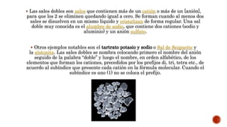 Las sales dobles contienen más de un catión o anión. Se forman cuando dos o más sales se disuelven en un mismo líquido y cristalizan juntas. Un ejemplo es el alumbre de sodio, que contiene sodio y aluminio. Las sales dobles se nombran colocando primero el anión, luego la palabra "doble", y luego los cationes en orden alfabético con prefijos como di, tri o tetra según su subíndice. Las sales dobles son compuestos eléctricamente neutros formados por la igualación de las c