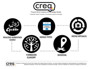 Francis Ortiz Creative Art & Design Studio es una empresa de consultoría tecnológica que ofrece servicios de diseño gráfico, web, formación y comunicación digital, con un enfoque en la innovación y el uso de tecnologías avanzadas como la realidad aumentada y geolocalización. Fundada en 1999, la empresa ha evolucionado a lo largo de los años, estableciendo asociaciones con compañías como Eurodat y Itop Consulting para proporcionar soluciones personalizadas a sus clientes. Además, ofrece servicios como visitas virtuales, diseño web responsivo y estrategias de marketing digital para optimizar la presencia online de las empresas.
