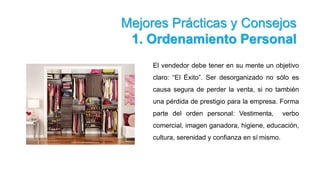 Este documento describe las mejores prácticas y consejos para la preparación de una venta, incluyendo orden personal y laboral, conocer el producto y la empresa, identificar prospectos, precalificarlos, y prever posibles objeciones.