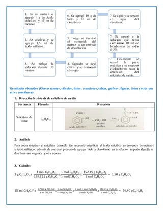 Este documento describe una práctica de laboratorio para sintetizar salicilato de metilo a partir de ácido salicílico y metanol. Explica los objetivos, reactivos, procedimiento experimental que incluye la reacción de esterificación, cálculos del rendimiento teórico y conclusiones. Sin embargo, no se pudo determinar el rendimiento experimental debido a que el producto final se descartó por error.