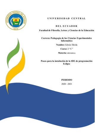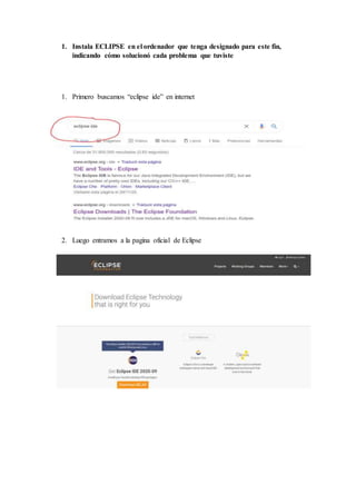 Este documento proporciona los 8 pasos para instalar el IDE de programación Eclipse en un ordenador, que incluyen: 1) buscar e ir a la página de descarga de Eclipse, 2) descargar e iniciar el instalador, y 3) elegir la ubicación e instalar Eclipse.