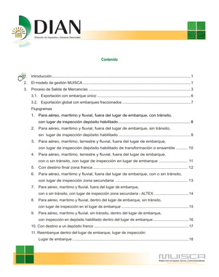 Este documento presenta el modelo de gestión MUISCA para el proceso de salida de mercancías de Colombia. Describe 27 flujogramas que representan diferentes rutas de exportación de mercancías por aire, mar, tierra y río, tanto dentro como fuera del lugar de embarque. También explica los pasos para ingresar una solicitud de autorización de embarque, trasladar mercancías, certificar el embarque y presentar la declaración de exportación.