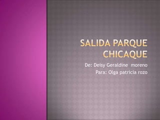 El documento describe una excursión al Parque Chicaque realizada por estudiantes. Durante la salida, los estudiantes se organizaron en filas por curso y tomaron buses al parque, donde recibieron refrigerios. Luego, cada curso fue asignado a un guía para realizar una caminata durante la cual aprendieron sobre la flora y fauna local. La caminata incluyó pasar por montañas, bosques, senderos coloniales y quebradas, además de disfrutar de una cascada. Al finalizar la jornada, los estudiantes regres