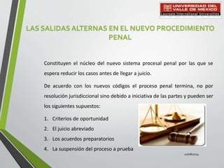 Este documento describe cuatro salidas alternas al juicio en el nuevo procedimiento penal: 1) Criterios de oportunidad, donde el Ministerio Público puede abstenerse de la persecución penal en ciertos casos; 2) Juicio abreviado, un proceso más rápido y con penas menores; 3) Acuerdos preparatorios, un pacto entre la víctima y el imputado; y 4) Suspensión del proceso a prueba, donde el proceso se suspende bajo ciertas condiciones como reparar el daño.
