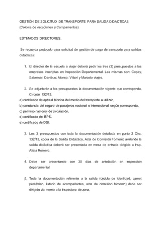 El documento resume el protocolo para solicitar el pago del transporte para salidas didácticas de escuelas, que requiere que los directores obtengan 3 presupuestos de empresas de transporte registradas, adjunten documentación requerida, y presenten la solicitud con al menos 30 días de anticipación a la Inspección departamental junto con otros documentos requeridos para la salida didáctica.