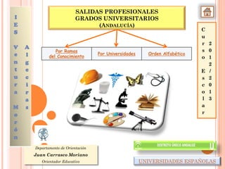 Este documento presenta información sobre las salidas profesionales de diferentes grados universitarios, organizados por ramas del conocimiento. Se describen brevemente varios grados pertenecientes a Artes y Humanidades como Bellas Artes, Conservación y Restauración de Bienes Culturales, Estudios Árabes e Islámicos, entre otros. También se incluyen las universidades andaluzas donde se pueden cursar cada uno de estos grados.