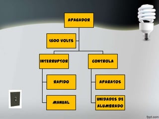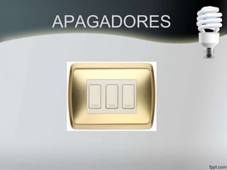 Un apagador o interruptor es un dispositivo eléctrico que permite controlar el encendido y apagado de aparatos eléctricos de bajo voltaje mediante la conexión y desconexión de los contactos. Existen diferentes tipos de apagadores como de 3 vías, 4 vías y con protección contra sobrecorrientes, que permiten controlar unidades de alumbrado de forma sencilla y rápida.