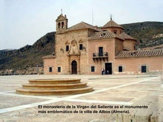 El monasterio de la Virgen del Saliente en Albox, Almería es el monumento más emblemático de la ciudad. Data de mediados del siglo XVIII y muestra una transición del estilo barroco al neoclásico. La fotografía muestra varias partes del monasterio como el patio bordeado por el claustro, uno de los pasillos del claustro, y la puerta y capilla de la Virgen en forma de cruz latina.