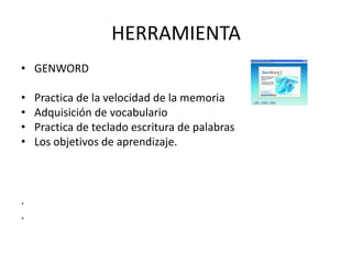 Este documento describe varias herramientas para crear contenidos digitales, incluyendo Genword para practicar la velocidad de memoria y vocabulario, Ardora que permite a docentes crear contenido web sin conocimiento técnico, y el sistema Lim que permite crear materiales educativos a través de un editor y visualizador en formato XML. También menciona que el sitio web de Arduino fue actualizado con nuevo contenido sobre placas uno mega y tutoriales.