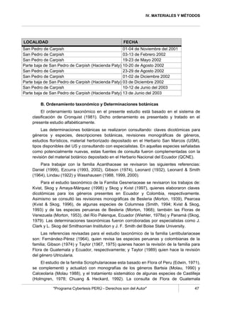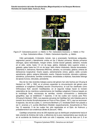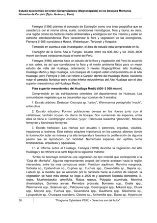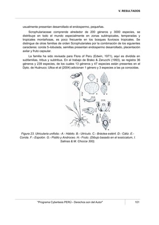 Este documento es la dedicatoria de una tesis sobre el orden Scrophulariales en los bosques montanos de Carpish, Huánuco. Agradece a sus padres, hermano, profesores y compañeros por su apoyo durante la realización de la tesis. También agradece a las comunidades locales por su ayuda durante las expediciones de campo. Finalmente, presenta un resumen del estudio taxonómico realizado, en el cual se reportan 4 familias, 20 géneros y 38 especies de plantas.