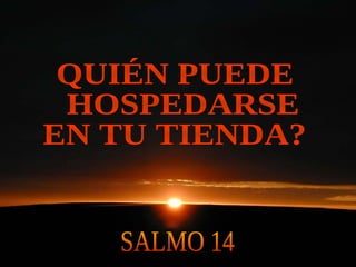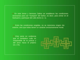 El salmo establece que para ser huésped del Señor y participar en el culto divino, se requiere vivir con justicia y amor hacia los demás en lugar de rituales externos. Según el salmo, aquel que desea hospedarse en la tienda de Dios debe proceder honradamente, practicar la justicia, no difamar ni hacer daño a otros, y honrar a quienes temen al Señor.