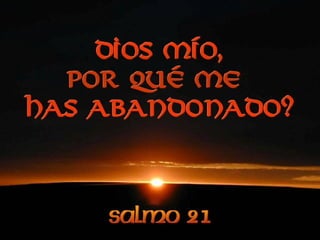 Este salmo describe el intenso sufrimiento de un hombre justo que se siente abandonado por Dios, pero que mantiene su fe en Él. A pesar del dolor, el salmista expresa su confianza en que Dios lo liberará. Jesús citó este salmo mientras estaba en la cruz para expresar su propio sufrimiento. Aunque parezca contradictorio, el salmo termina con alabanzas a Dios, invitando a todos a celebrarlo.