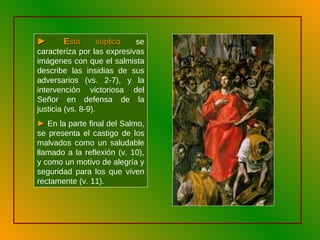 El salmo describe las insidias de los adversarios del salmista y la intervención victoriosa de Dios en su defensa. Cristo también sufrió acusaciones injustas pero Dios lo resucitó llenándolo de alegría. El salmista ruega a Dios que lo proteja de sus enemigos y sus palabras venenosas, y que Dios lo llene de paz y alegría como a Cristo resucitado.
