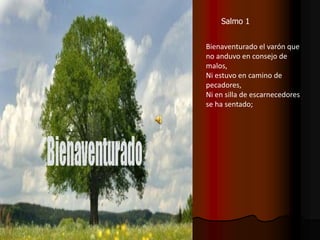 El salmo describe a un hombre justo que no se junta con malos ni pecadores, sino que encuentra placer en la ley de Dios. Este hombre justo es como un árbol plantado junto al agua que siempre da fruto, mientras que los malos son como paja que se lleva el viento y no se levantarán en el juicio con los justos.