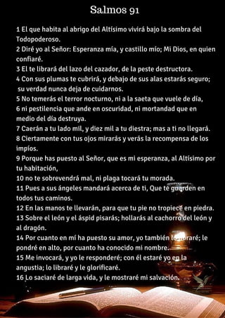 Este salmo describe las bendiciones de aquellos que ponen su confianza en Dios. Afirma que Dios protegerá a los que buscan su refugio de peligros como plagas, pestes, temores nocturnos y muerte. Promete que aunque caigan miles a su lado, el mal no los tocará. Finalmente, dice que Dios enviará a sus ángeles para guiarlos y protegerlos de todo peligro.