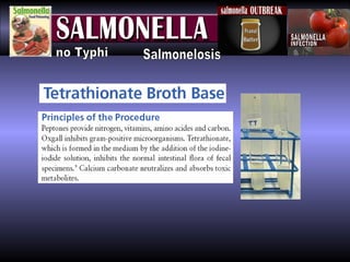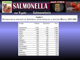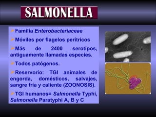 El documento describe las características de Salmonella, incluyendo que pertenece a la familia Enterobacteriaceae, puede causar infecciones en humanos y animales, y que las especies más comunes que causan infección en humanos son Salmonella enterica serotipo Typhi y Paratyphi, las cuales son responsables de millones de casos de fiebre tifoidea y cientos de miles de muertes cada año.