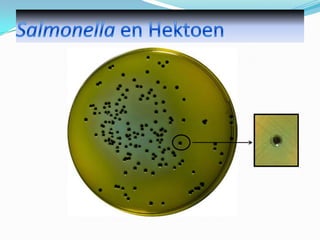 Este documento describe la bacteria Salmonella, una de las principales causas de enfermedades transmitidas por los alimentos. Salmonella es una bacteria zoonótica que puede causar cuadros gastrointestinales agudos en humanos y animales. Se transmite principalmente a través de alimentos contaminados de origen animal, como carnes y huevos, pero también por contacto directo con animales enfermos. El control de Salmonella es importante para la salud pública debido a su alta prevalencia y capacidad de resistencia en el medio ambiente.