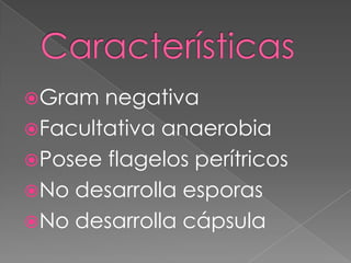 El documento describe las características de la Salmonella, incluyendo que es una bacteria gramnegativa, facultativa anaerobia y sin esporas. Se transmite principalmente a través de alimentos contaminados y su síntoma principal es la fiebre tifoidea o infección intestinal aguda con diarrea, dolor abdominal y fiebre. El tratamiento consiste en rehidratación y antibióticos.
