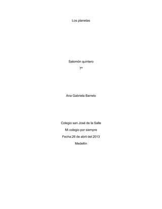 Este documento presenta información sobre los planetas del sistema solar. Brevemente describe cada planeta, incluyendo datos como su tamaño, composición, satélites e inclinación axial. Explica que Mercurio es el planeta más cercano al Sol, Venus es el más luminoso, y la Tierra es el único que alberga vida. Marte tiene casquetes polares y satélites pequeños, mientras que Júpiter, Saturno, Urano y Neptuno son planetas gaseosos.