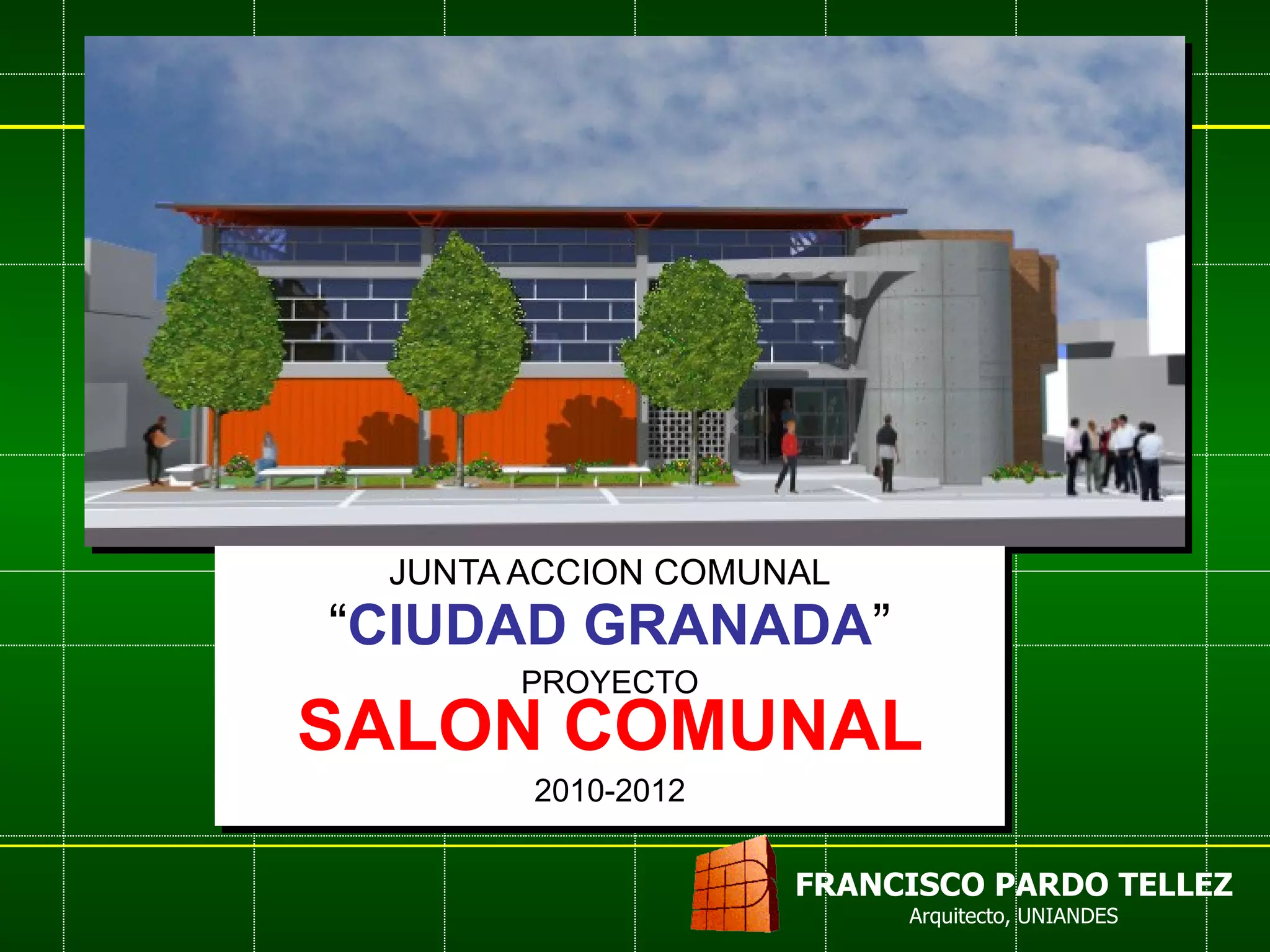 El documento presenta un proyecto para construir un salón comunal en la Ciudad Granada en Bogotá entre 2010-2012. El proyecto busca resolver problemas con la documentación del terreno como inconsistencias en escrituras y linderos, y propone retroceder el predio para crear un espacio público que dé importancia y escala al salón comunal, el cual incluirá una sala múltiple, aulas, oficinas y servicios en los pisos primero y segundo.