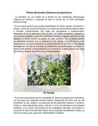 El documento describe las características de la planta del tomate y del fruto tomate. Explica los requisitos para el cultivo del tomate, incluyendo temperatura, humedad, luminosidad y tipo de suelo. También describe factores de calidad del tomate como aspecto, color, sabor y olor. Finalmente, brinda una breve historia del cultivo y propagación mundial del tomate.