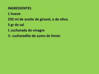 Este documento proporciona una receta para hacer salsa mahonesa. Incluye los ingredientes necesarios como huevo, aceite, sal, vinagre y zumo de limón. Explica los pasos para emulsionar los ingredientes en la batidora y conseguir una salsa espesa y cremosa. Finalmente, menciona que la mahonesa es una de las salsas más utilizadas en la cocina y deseaba buen provecho.