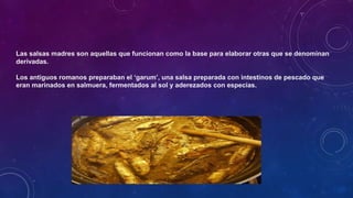 Las salsas madres son bases para crear salsas derivadas, siendo la gastronomía francesa reconocida por su clasificación, destacando salsas como béchamel, velouté y soubise. La elaboración de salsas se perfeccionó durante el siglo XVIII, logrando sabores más complejos. La salsa béchamel, por ejemplo, combina leche con roux y especias, mientras que la salsa mornay es una variación con crema y queso.