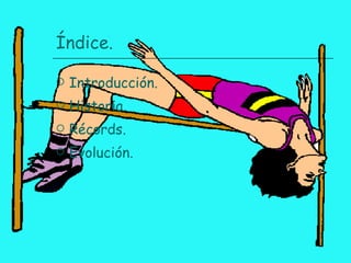 El documento resume la historia del salto de altura en los Juegos Olímpicos. Se celebró por primera vez en los Juegos Olímpicos masculinos de 1896 en Atenas y en los femeninos de 1928 en Ámsterdam. Originalmente había dos estilos de salto, con y sin impulso, pero ahora solo se usa el estilo con impulso. El récord mundial masculino actual es 2.45 metros por Javier Sotomayor en 1993 y el femenino es 2.09 metros por Stefka Kostadinova en 1987.