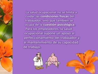 El documento habla sobre la importancia de la salud ocupacional y la necesidad de garantizar el bienestar de los trabajadores. Aborda los principales problemas de salud que debe tratar la salud ocupacional como accidentes laborales, estrés laboral y enfermedades causadas por la exposición a sustancias. También menciona que los gobiernos deben realizar inspecciones para verificar el cumplimiento de las normas de salud ocupacional.