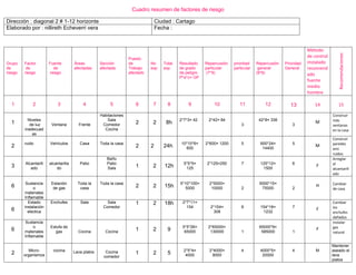 El documento presenta un cuadro resumen de los principales factores de riesgo identificados en una casa ubicada en Cartago. Se identifican 6 grupos de riesgo que incluyen niveles inadecuados de luz, ruido, alcantarillado dañado, materiales inflamables, instalaciones eléctricas dañadas y presencia de microorganismos. Para cada factor se detalla la fuente, áreas afectadas, sección afectada, puesto de trabajo afectado y se realiza una evaluación cuantitativa del riesgo así