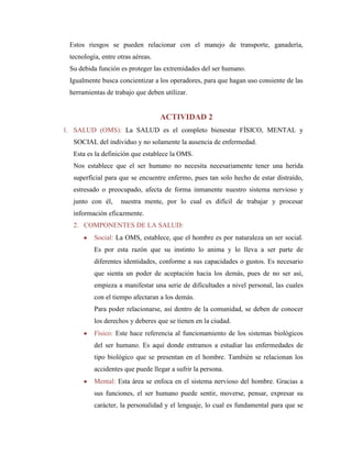 El documento habla sobre el sistema general de riesgos profesionales, la administración de riesgos profesionales (ARP), la salud ocupacional, la seguridad industrial y diferentes factores relacionados con la salud y seguridad en el trabajo. Explica conceptos como salud, componentes de la salud, factores de riesgo, prevención de factores de riesgo ocupacionales e inspección de seguridad e higiene ocupacional.