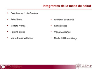 Este documento resume las discusiones de la mesa de salud en el evento CADE Ejecutivos 2010 en Urubamba, Perú. Resalta que Perú tiene amplias desigualdades en la salud de madres y niños, control limitado de enfermedades transmisibles, y un crecimiento acelerado de enfermedades crónicas. También identifica cuatro factores que agravan la situación de salud en el país: la dinámica demográfica, condiciones de vivienda, contaminación del aire y agua, y comportamientos de