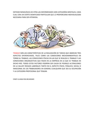 El documento define la salud como un estado de bienestar físico, mental y social, no solo la ausencia de enfermedades. Explica que la forma física es la capacidad del cuerpo para realizar ejercicio con resistencia, fuerza y otras habilidades. También habla sobre la salud mental como un estado psíquico equilibrado y la autoaceptación. Además, describe que las enfermedades son categorías mentales que ayudan a entender y categorizar diferentes condiciones, y que el trabajo puede afectar la salud física, psíquica