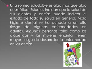 La salud dental indica el estado general de salud; mala higiene dental aumenta el riesgo de enfermedades. Aunque se pensaba que la pérdida de dientes era natural con la edad, el Centro Nacional para la Información Sobre el Higiene Bucal dice que siguiendo pasos sencillos como usar hilo dental y cepillarse los dientes, se pueden conservar los dientes para toda la vida.