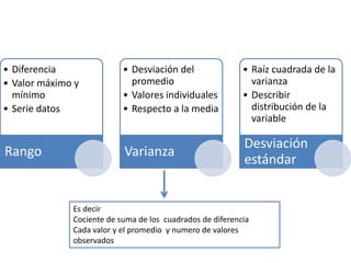 El documento aborda medidas de dispersión como rango, varianza y desviación estándar, centrándose en su aplicación a datos continuos y su cálculo a partir de observaciones. Se explica cómo estos conceptos ayudan a describir la distribución de variables y agrupar datos, destacando la importancia de los cuantiles para representar la dispersión. Además, se menciona la relación entre media, mediana y moda en contextos simétricos.